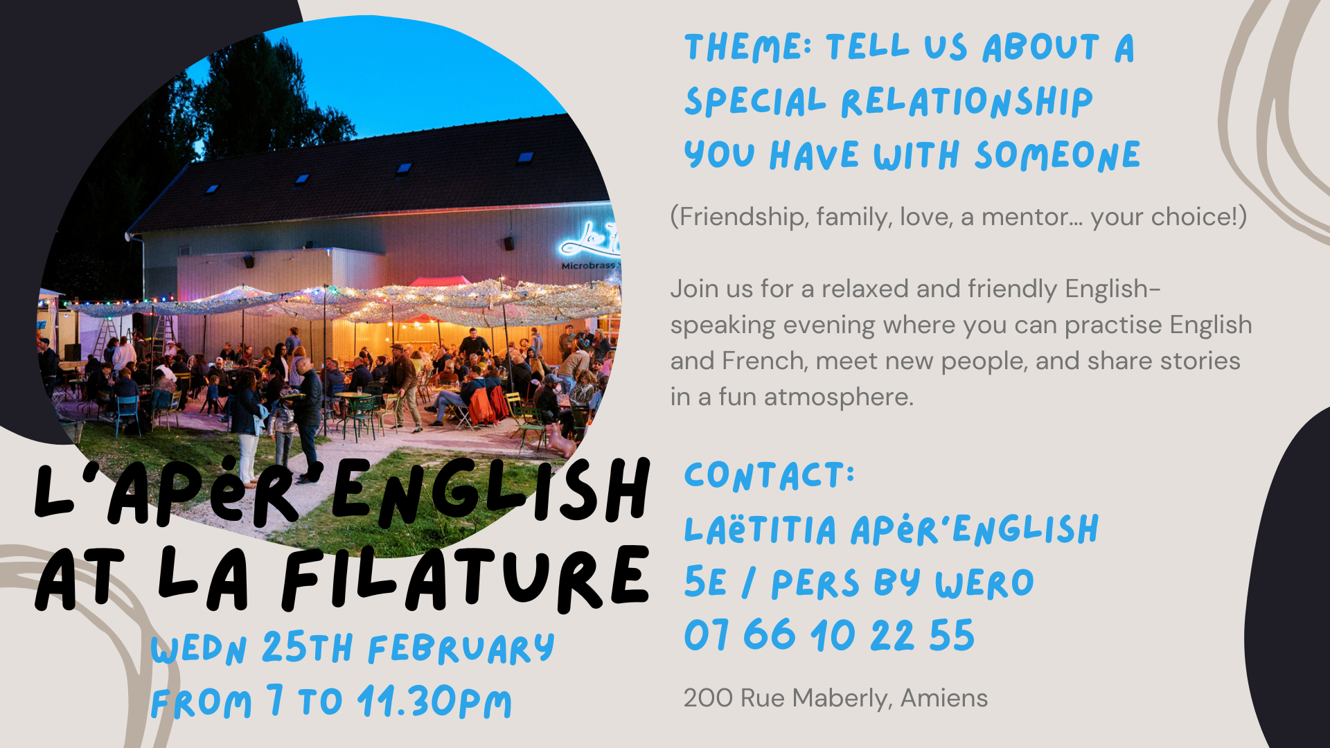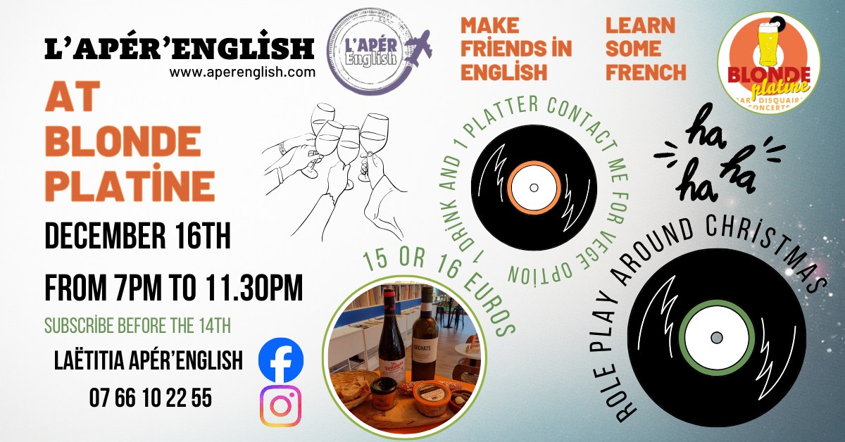 Rejoignez-nous à l'Apér'English pour vivre des soirées inoubliables, où vous pourrez participer à des discussions passionnantes, vous divertir avec des jeux interactifs. Vous rencontrerez des étrangers expatriés, d'autres passionnés de la langue anglaise et du français, et passerez des moments agréables tout en améliorant vos compétences linguistiques !